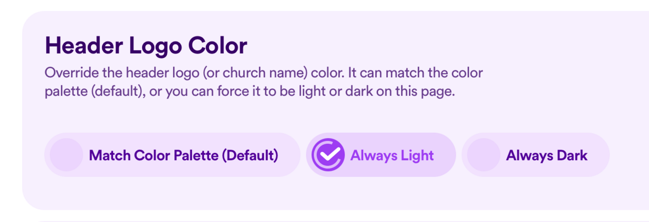Nucleus intelligently shows the light or dark variant of your church’s logo on each page depending on the contrast of the page. Generally, you can set your logos and forget them. There are some instances where you may want to take control over which version of your logo is displayed on a certain page.